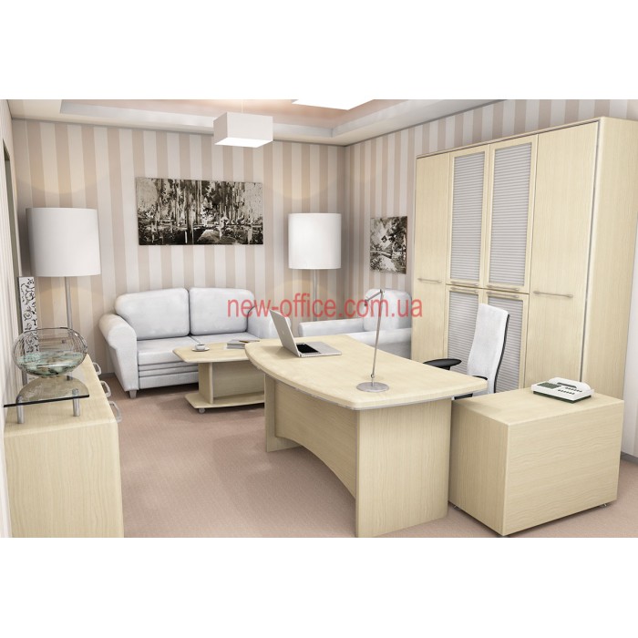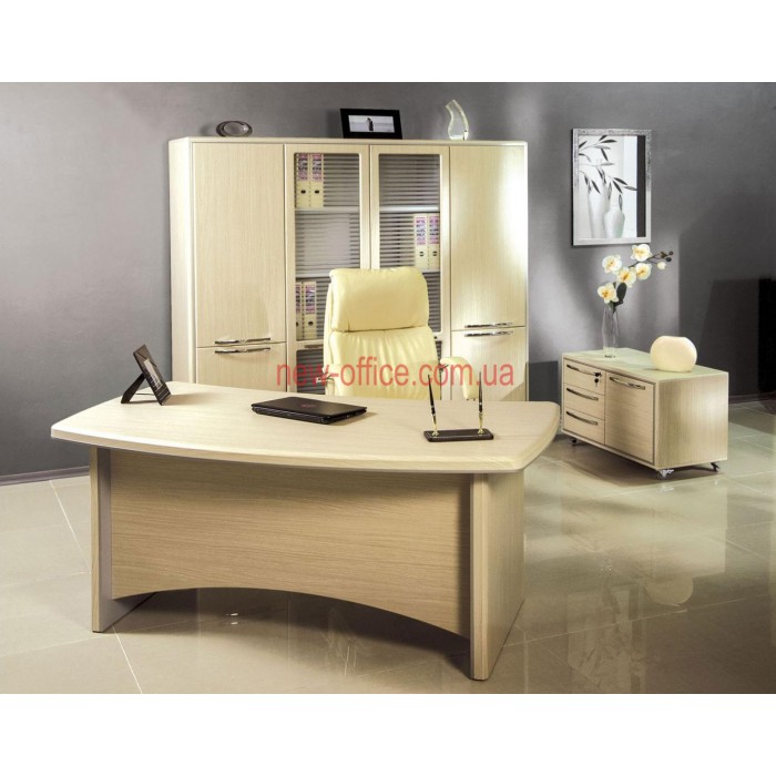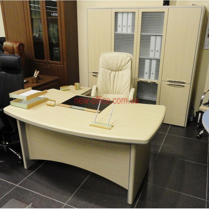 Кабінет керівника Альянс МДФ – виконаний у сучасному міському стилі, він дозволяє не лише займатися повсякденною роботою, а й приймати клієнтів, проводити конференції та наради, вести переговори з бізнес-партнерами. Меблі мають лаконічний стриманий дизайн, але при цьому виглядають цікаво та дорого. В обробці зроблено акцент на контраст ліній та текстуру натурального дерева, завдяки чому колір здається глибшим та насиченим. Кабінет Альянс зручний і практичний в експлуатації, він виготовлений з високоякісних матеріалів, які не потребують особливого догляду та відрізняються довговічністю. Комплектацію можна підібрати індивідуально залежно від форми та розміру офісу та особливостей його використання.