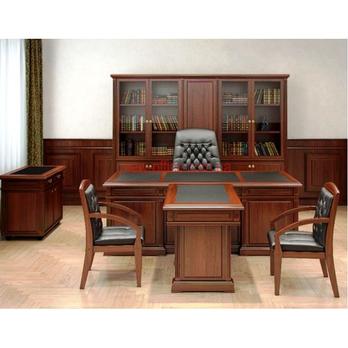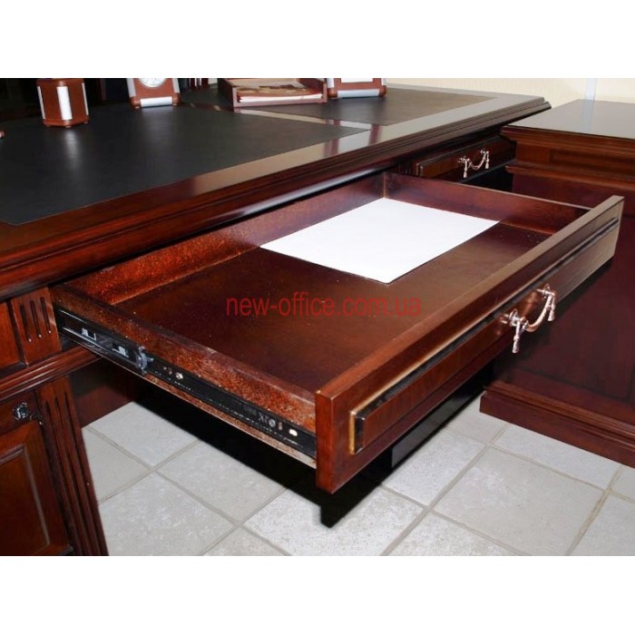Стіл виготовлений із натуральних матеріалів. Основа столу – плита МДФ вкрита натуральним шпоном лісового горіха. Лицьові частини столу мають покриття лаком у п'ять шарів. Поверхня столу керівника має три вставки зі шкіри чорного кольору, які забезпечують комфортність під час роботи за столом. Усі поверхні столу та внутрішні відділення ящиків столу покриті натуральним шпоном. На висувних ящиках використовуються телескопічні напрямні повного висування, які забезпечують стійке висування та чудово переносять навантаження. Різьблені елементи класичного кабінету виконані з масиву дерева і надають столу строгість і солідність.