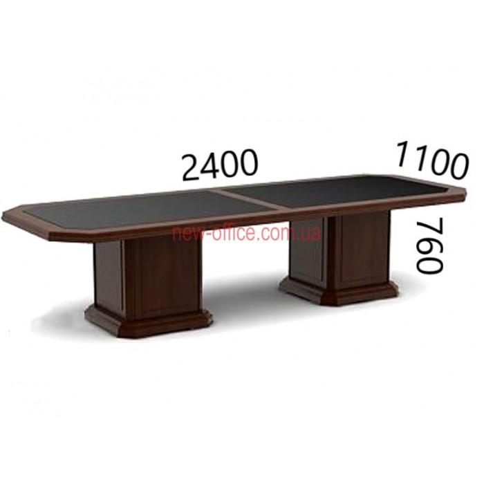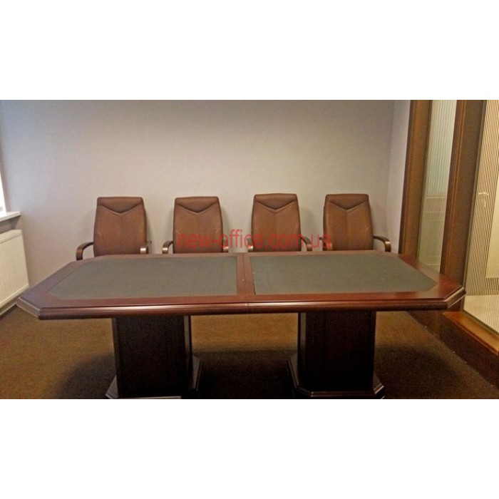 Стільниця конференц столу (стола переговорів) складається з дерев'яного каркасу з фігурною фільонкою та вставками із чорної шкіри. Поверхня конференційного столу має покриття із натурального шпону горіха з покриттям в п'ять шарів шовковисто-матового лаку. Товщина основної стільниці 50мм.