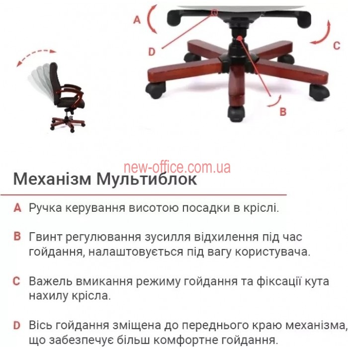 Механізми. Крісло Атлант укомплектовано механізмом мультиблок, з яким ви зможете повноцінно насолодитися часом, проведеним в цьому кріслі. Режим гойдання підвищеної комфортності дозволить розслабитися. Робоче положення можна підібрати і зафіксувати під найбільш комфортним для себе кутом сидіння і спинки. За допомогою декоративного гвинта під сидінням мультиблок просто регулюється відповідно до ваги користувача, що дозволяє йому правильно виконувати свою роботу. Газліфтом легко можна налаштувати висоту крісла з урахуванням свого зростання, щоб влаштуватися в ньому з максимально комфортно.