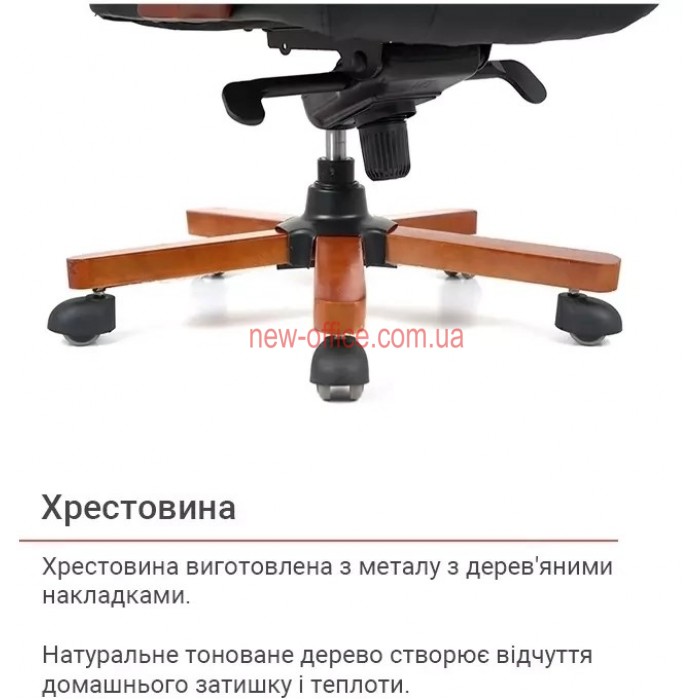 Підлокітники. Престижність даного крісла підкреслюють формені, широкі підлокітники. Їх Г-подібний вигин і розмір підібрані так, щоб рукам було комфортно спиратися на них. Натуральне тоноване дерево створює відчуття домашнього затишку і теплоти. М'які накладки захищають руки від контакту з твердою поверхнею і дарують додатковий комфорт.