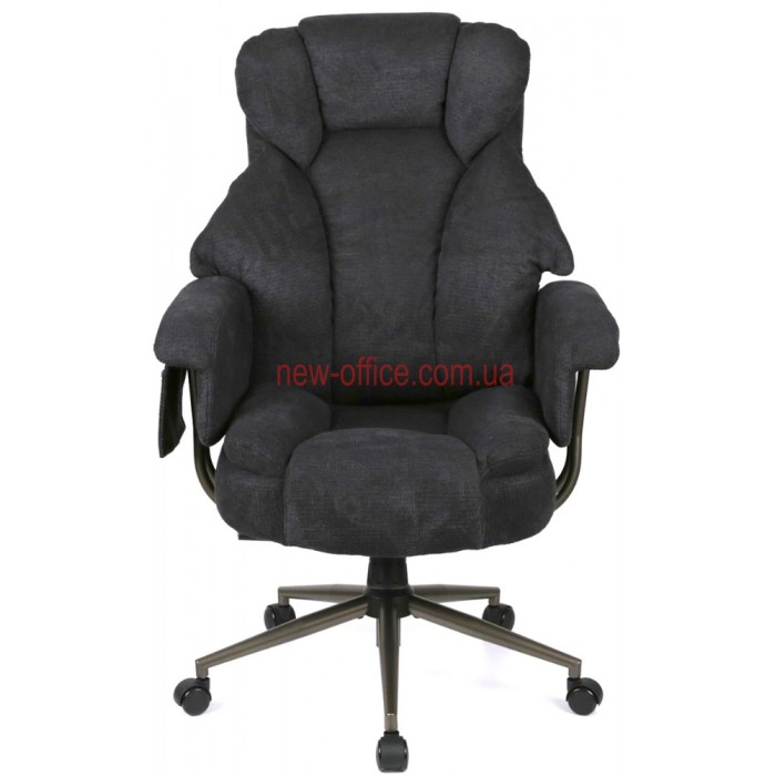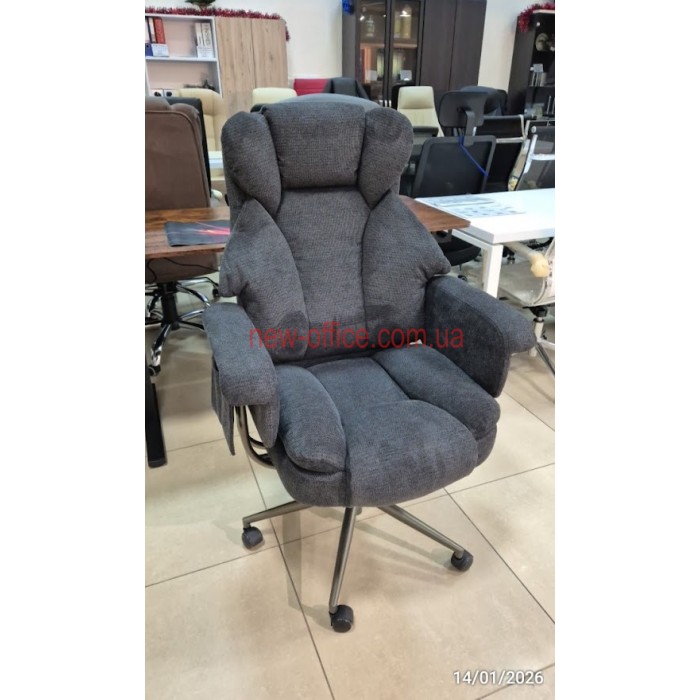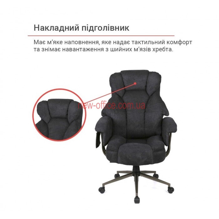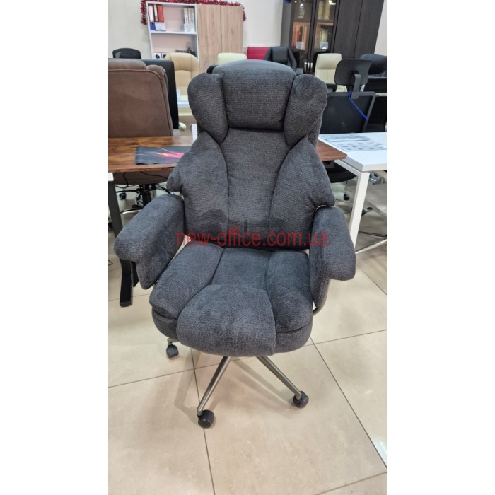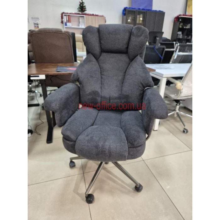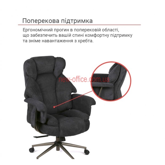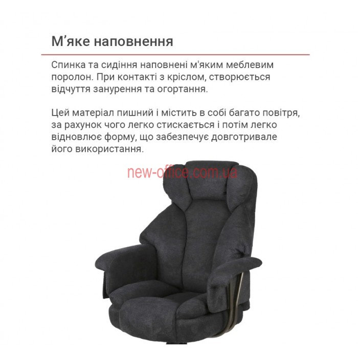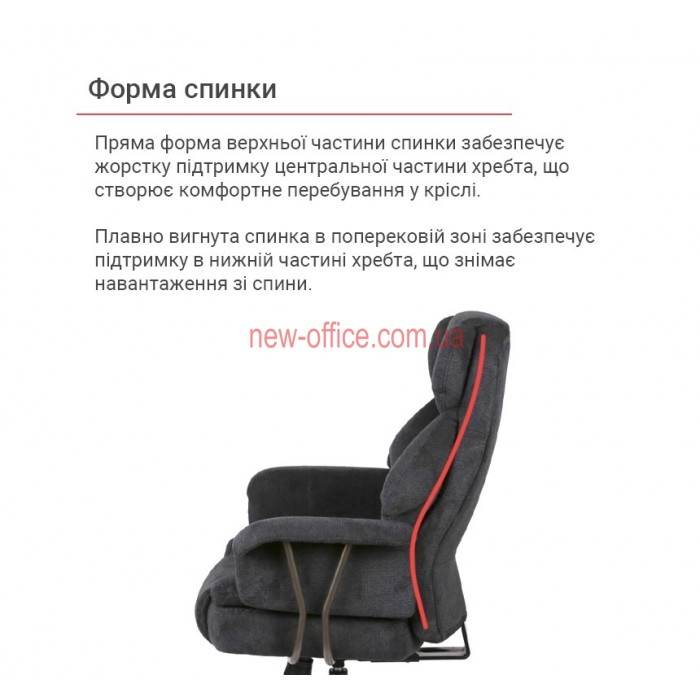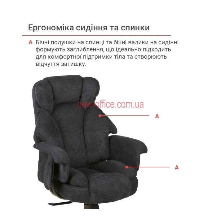 Особливості. Потрійна подушка спинки забезпечує підтримку шиї, грудного відділу та попереку окремо. Глибоке сидіння має додатковий м'який "наплив" під колінами, що запобігає затіканню ніг. Використання металу в основі та підлокітниках робить крісло надійнішим за пластикові аналоги.