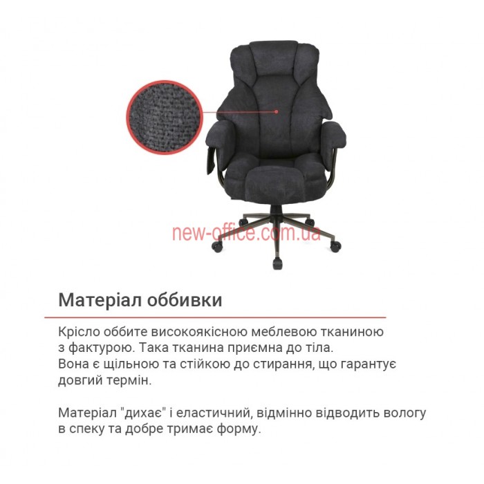 Оббивка. Крісло оббите високоякісною текстильною тканиною з фактурою. Така тканина значно приємніша до тіла, ніж шкіра або екошкіра, особливо влітку, оскільки вона "дихає". Тканина є щільною та стійкою до стирання, що гарантує довгий термін.