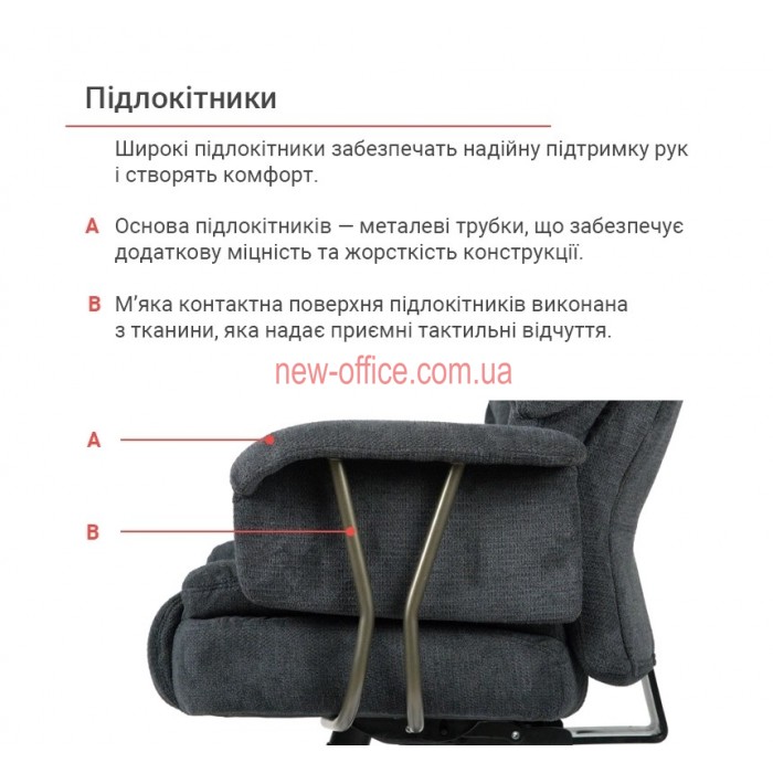 Підлокітники. Підлокітники інтегровані в загальний дизайн крісла. Зверху вони мають товстий шар наповнювача та оббиті тією ж тканиною, що й усе крісло. Основа підлокітників — металеві трубки в колір хрестовини, що забезпечує додаткову міцність та жорсткість конструкції. Висота підлокітника стандартизована тож ідеально підходить під будь-який зріст.