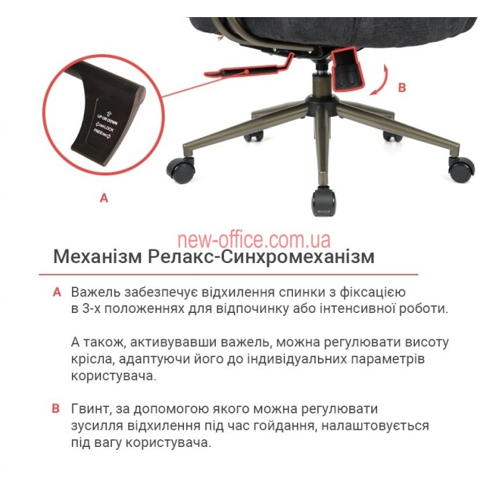 Механізм. Крісло оснащене вдосконаленим механізмом гойдання Релакс Синхро, який забезпечує синхронне відхилення спинки та сидіння в оптимальному співвідношенні, імітуючи природні рухи тіла. Цей механізм дозволяє фіксувати крісло в 3 різних положеннях для відпочинку або інтенсивної роботи. Надійний газліфт дозволяє легко та плавно регулювати висоту крісла, адаптуючи його до індивідуальних параметрів користувача.