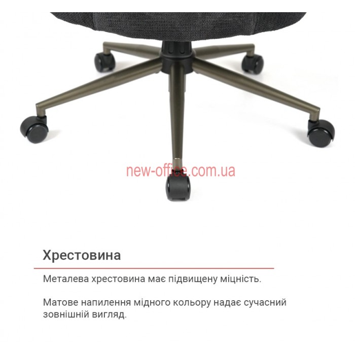 Хрестовина. Виготовлена з міцного металу з матовим напиленням. Її тонкі, елегантні промені витримують високе навантаження. Оснащена стандартними прогумованими роликами для легкого переміщення по офісному покриттю.