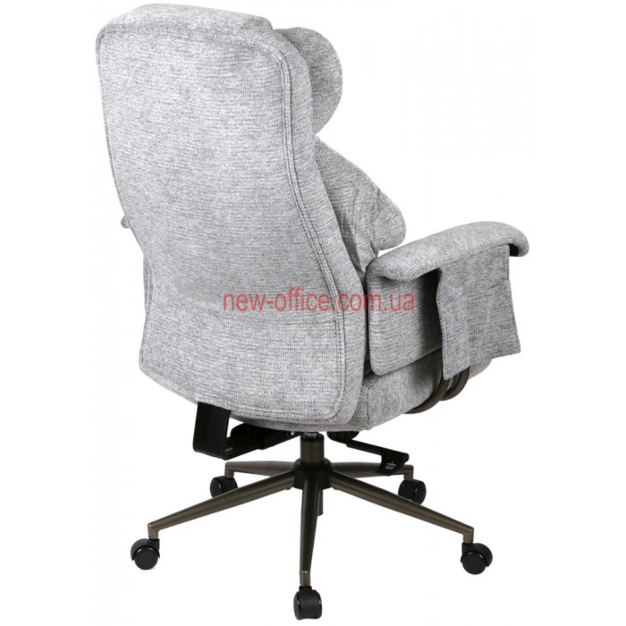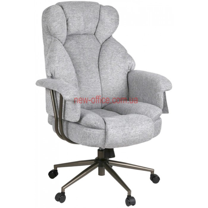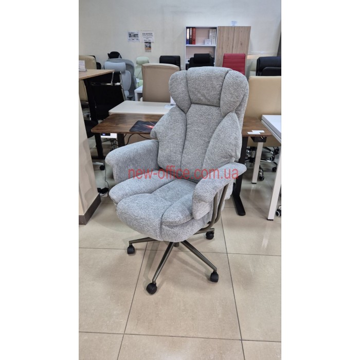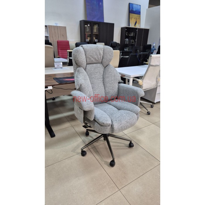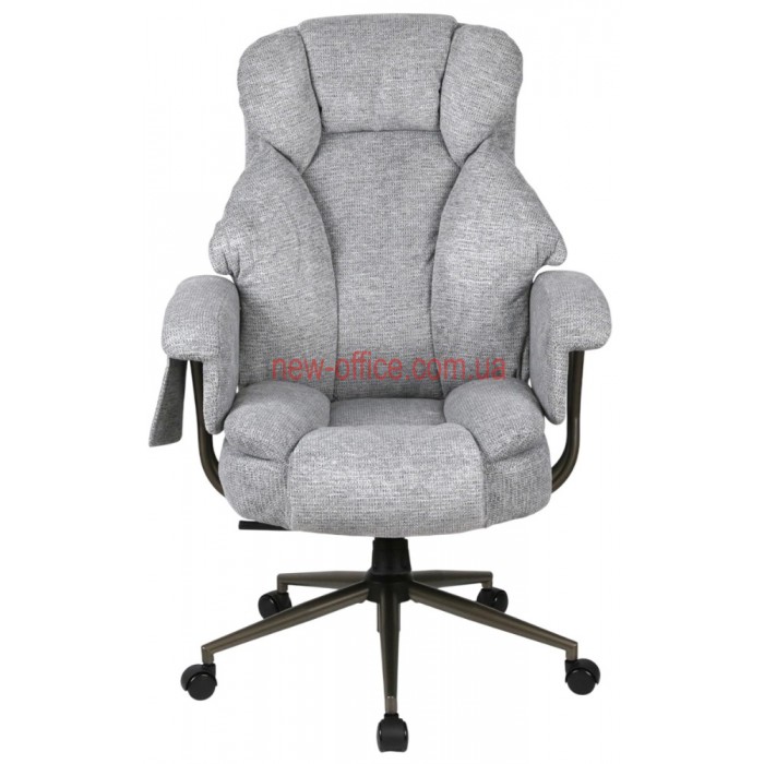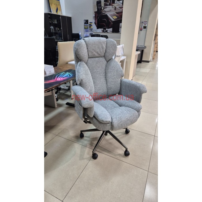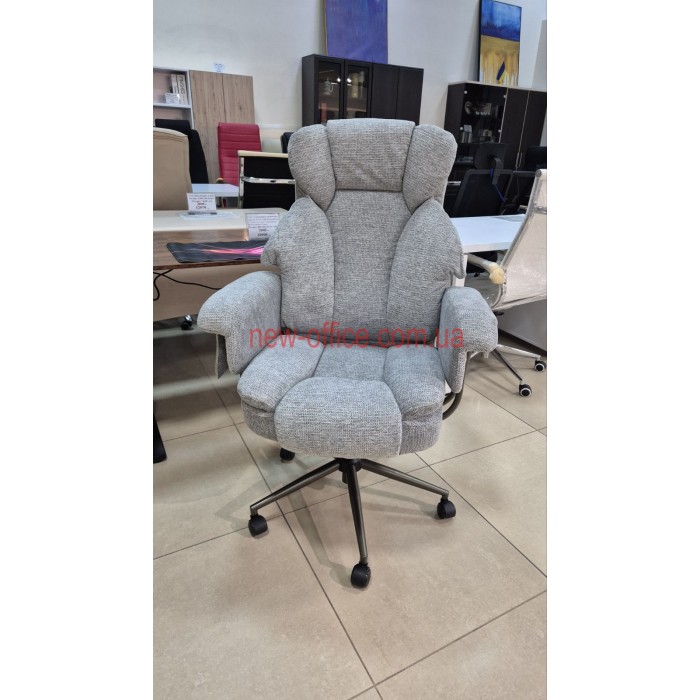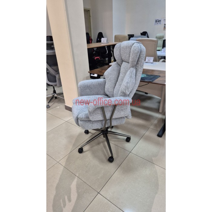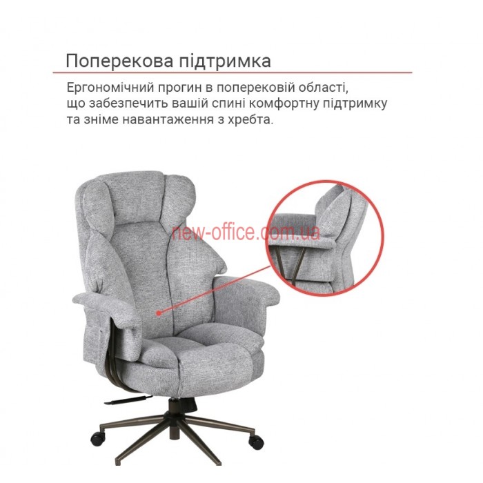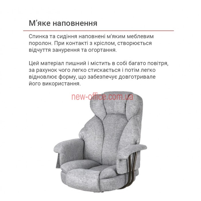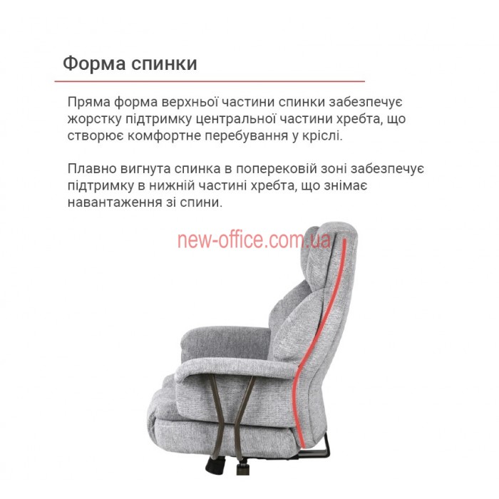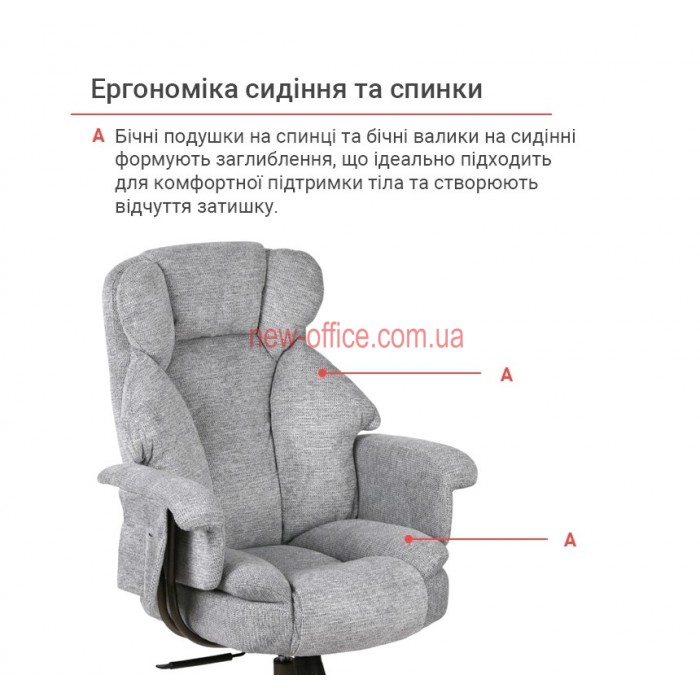 Особливості. Потрійна подушка спинки забезпечує підтримку шиї, грудного відділу та попереку окремо. Глибоке сидіння має додатковий м'який "наплив" під колінами, що запобігає затіканню ніг. Використання металу в основі та підлокітниках робить крісло надійнішим за пластикові аналоги.