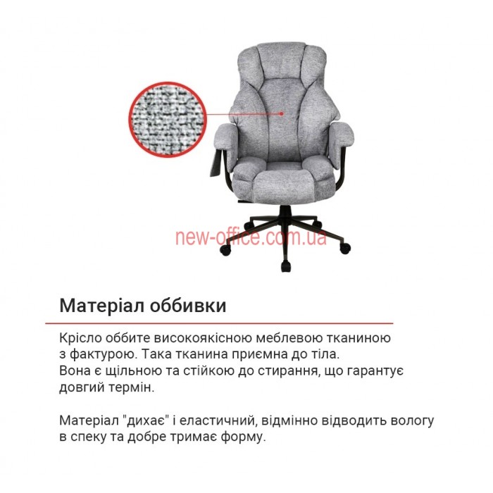 Оббивка. Крісло оббите високоякісною текстильною тканиною з фактурою. Така тканина значно приємніша до тіла, ніж шкіра або екошкіра, особливо влітку, оскільки вона "дихає". Тканина є щільною та стійкою до стирання, що гарантує довгий термін.