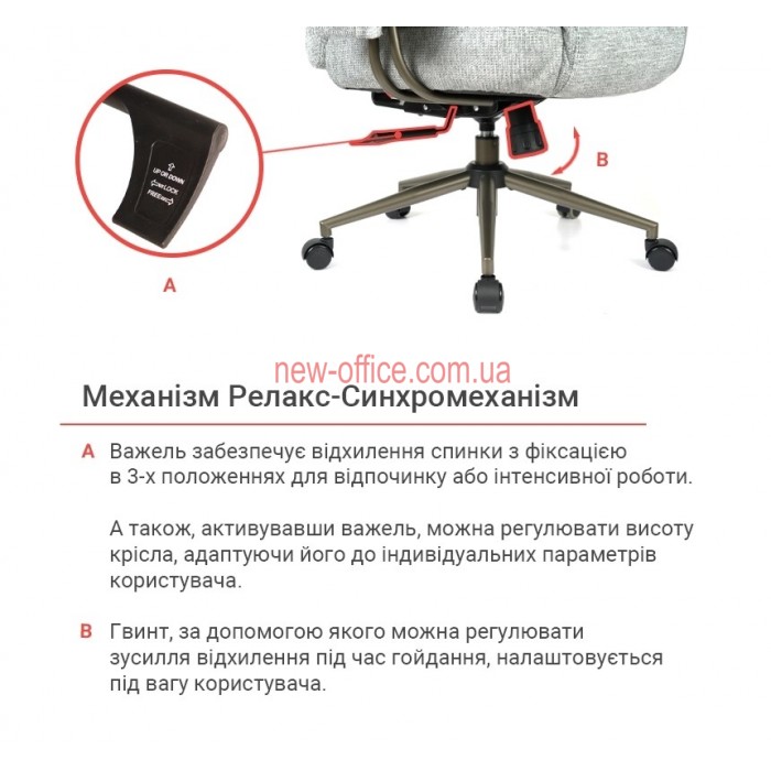 Механізм. Крісло оснащене вдосконаленим механізмом гойдання Релакс Синхро, який забезпечує синхронне відхилення спинки та сидіння в оптимальному співвідношенні, імітуючи природні рухи тіла. Цей механізм дозволяє фіксувати крісло в 3 різних положеннях для відпочинку або інтенсивної роботи. Надійний газліфт дозволяє легко та плавно регулювати висоту крісла, адаптуючи його до індивідуальних параметрів користувача.