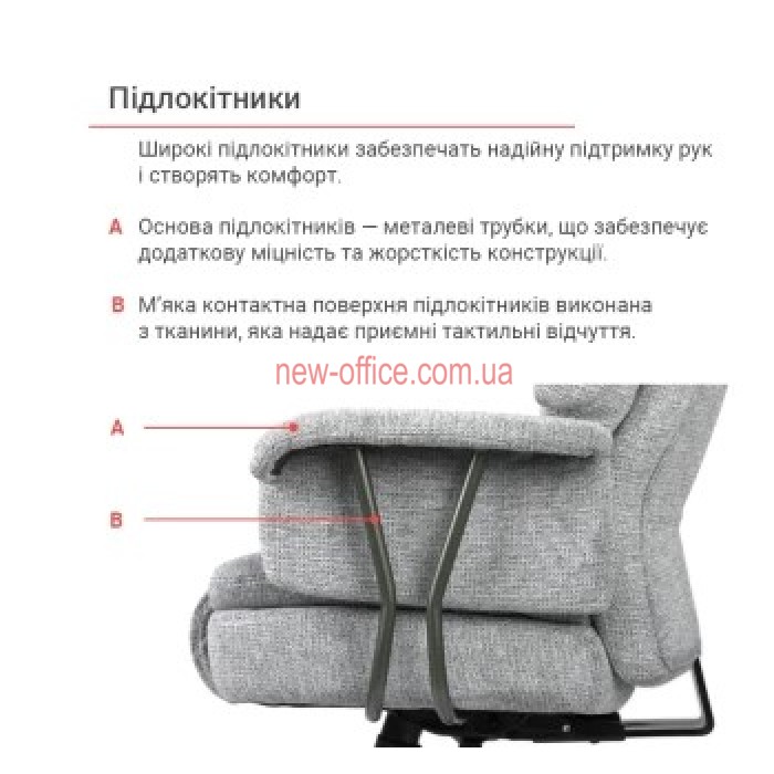 Підлокітники. Підлокітники інтегровані в загальний дизайн крісла. Зверху вони мають товстий шар наповнювача та оббиті тією ж тканиною, що й усе крісло. Основа підлокітників — металеві трубки в колір хрестовини, що забезпечує додаткову міцність та жорсткість конструкції. Висота підлокітника стандартизована тож ідеально підходить під будь-який зріст.