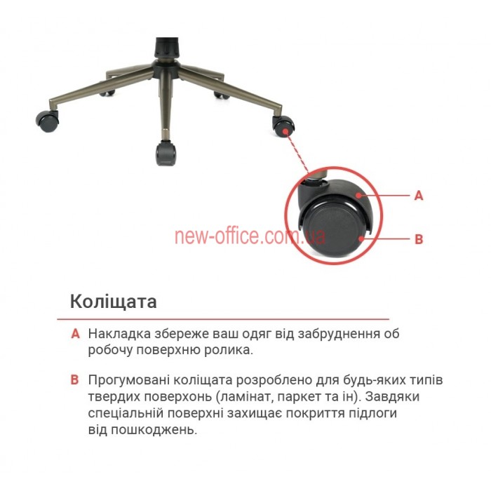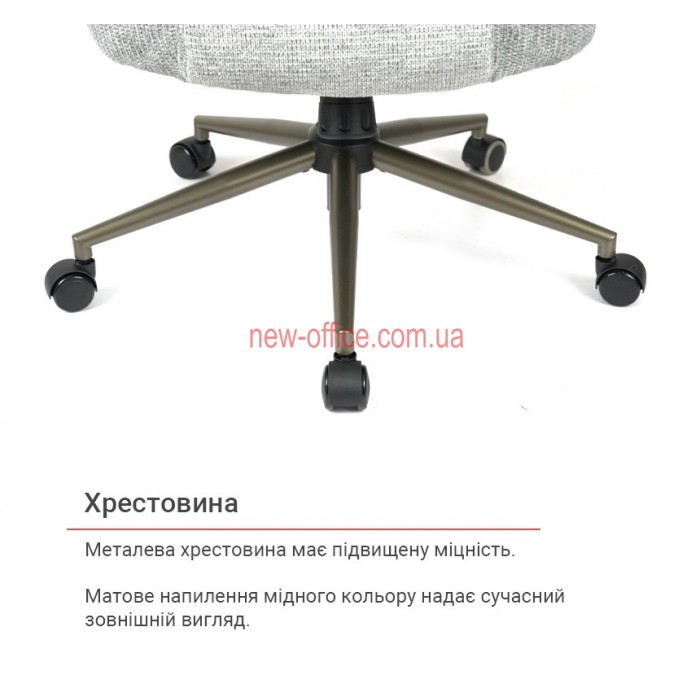 Хрестовина. Виготовлена з міцного металу з матовим напиленням. Її тонкі, елегантні промені витримують високе навантаження. Оснащена стандартними прогумованими роликами для легкого переміщення по офісному покриттю.